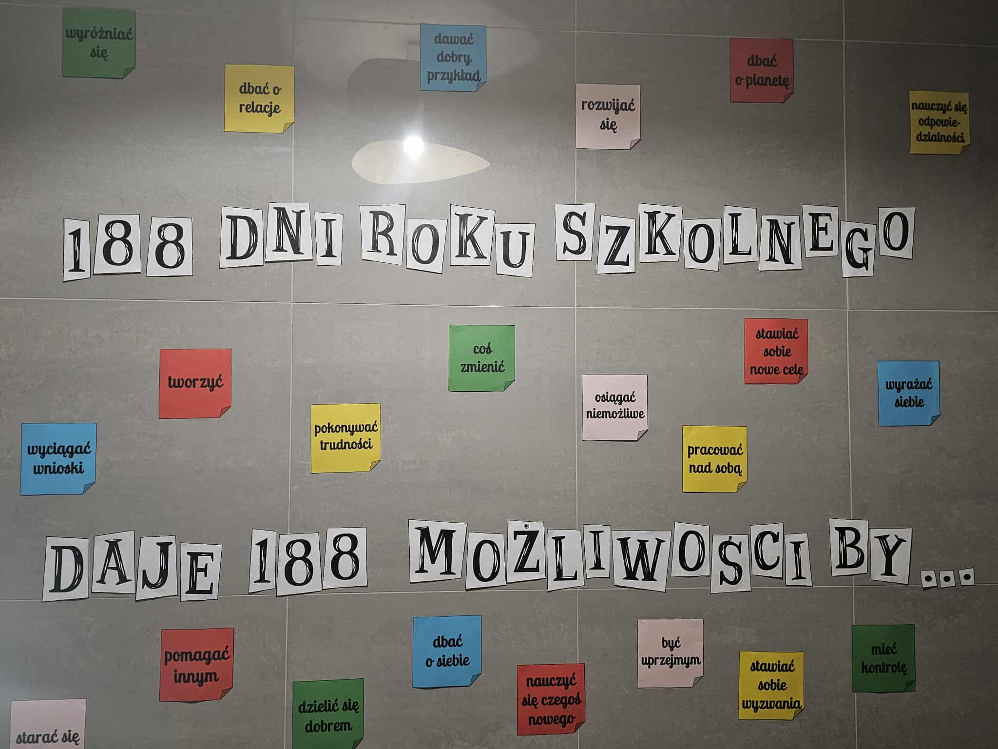 Na 188 dni roku szkolnego 2025/2026 życzymy Wam 188 możliwości, aby: pokonywać trudności, pomagać innym, rozwijać się, stawiać sobie nowe cele czy też osiągać to, co początkowo wydaje się niemożliwe. Rodzicom i opiekunom natomiast życzymy odpoczynku, spokoju i radości dnia codziennego.