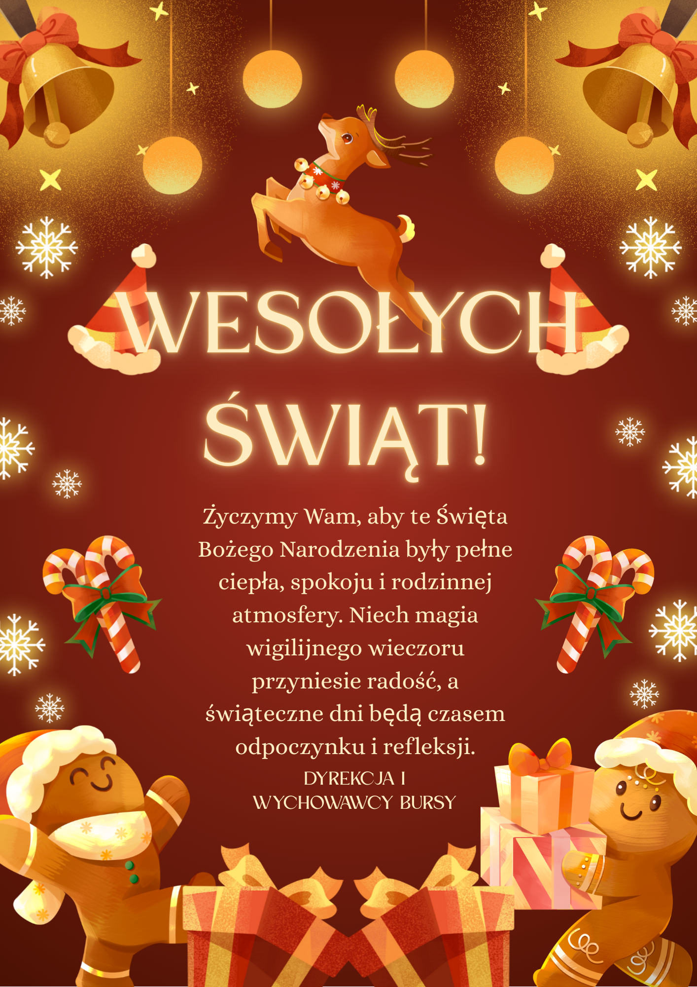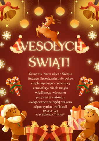Niech czas Bożego Narodzenia będzie dla naszych wychowanków i ich rodzin pełen ciepła, radości i wytchnienia od codziennego pędu. Zdrowych i pogodnych Świąt Bożego Narodzenia oraz wszelkiej pomyślności w Nowym Roku!